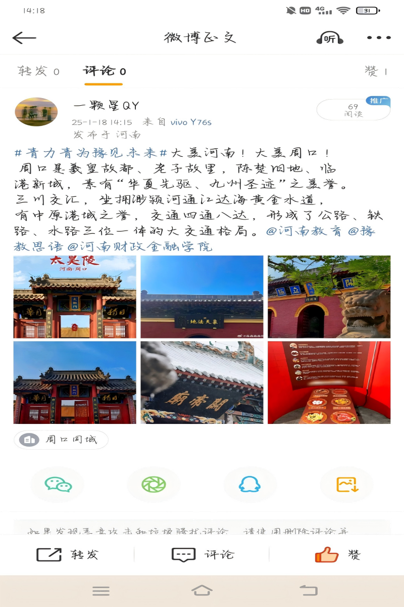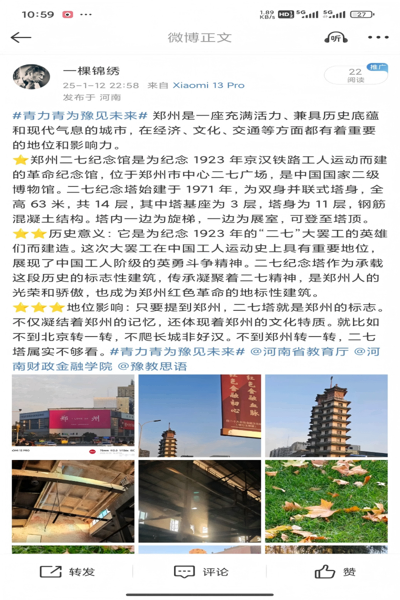 本次活动在新浪微博平台开展主题网络话题互动讨论。自活动启动以来,pp电子游戏平台官网通过线上线下相结合的方式,对活动进行广泛宣传,号召学院全体学生积极参与。活动期间,同学们通过拍摄短视频、照片讲述自身故事,不仅展现了科技为生活和学习带来的变革,还深入挖掘河南历史文化底蕴和风俗,让更多人领略到河南的独特魅力。同学们用心感受家乡巨变,挖掘时代故事,发现最美河南,以积极向上的精神面貌为活动增添了许多活力与色彩。活动共收到作品数百篇,充分展现了新时代青年的担当。