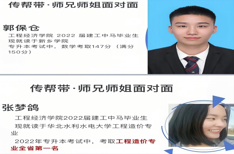 本次经验交流会邀请到pp电子2022届优秀毕业生郭保仓同学(现就读于新乡学院,2022年专升本考试中,高等数学147分)与张梦鸽同学(现就读于华北水利水电大学,2022年专升本考试中取得工程造价专业全省第一的成绩)进行经验分享。他们结合自身专升本的备考经历,详细介绍了报考院校及考试科目、考前资料收集、相关政策等,针对日常学习方法及复习期间的心态调整等问题,向师弟师妹们提出了良好的建议,鼓励大家,明确目标、坚定信心,努力学习,积极进取。在交流互动环节中,两位同学认真解答了学弟学妹们在复习过程中的困惑,提醒大家要时刻关注近年来专升本考试政策的变化,建议报考适合自己的学校和专业,尽量少走弯路,并祝愿同学们考出理想的成绩。他们恳切的言辞、用心地分享,赢得了在场学生们的阵阵掌声。(郭蓓蓓/文 王丹丹/图 车湘辉/审核)