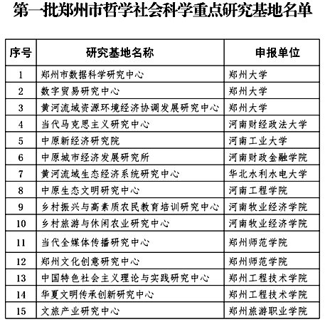 经郑州市社会科学界联合会组织专家评审,pp电子中原城市经济发展研究所等15个社科研究基地被确定为第一批郑州市哲学社会科学重点研究基地(具体名单如下)。