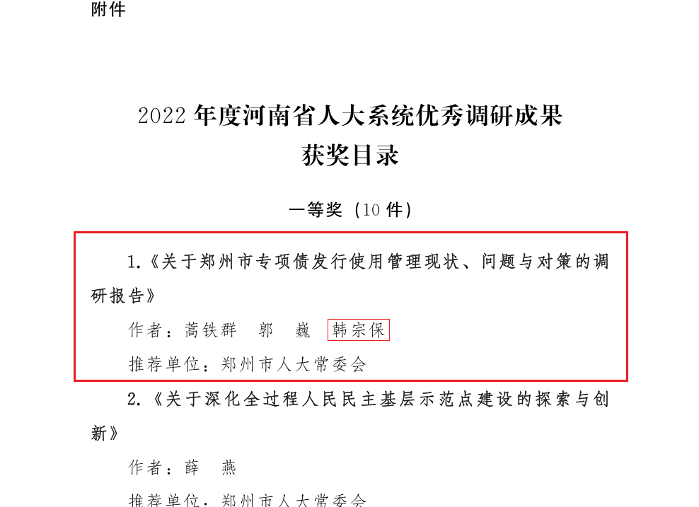 为深入学习贯彻习近平新时代中国特色社会主义思想,全面贯彻落实中央和省委人大工作会议精神,不断提升新时代人大工作质量和水平,根据省人大常委会2022年度工作要点安排,省人大常委会组织开展了2022年度全省人大系统优秀调研成果评选活动。近日,经省人大常委会组织有关专家评审,共选出优秀作品70件,其中一等奖10件、二等奖20件,三等奖40件,pp电子游戏平台官网韩宗保教授作为郑州市人大常委会聘请的预算审查监督专家,执笔完成的一项郑州市人大常委会办公厅2022年度重点调研课题《关于郑州市专项债发行使用管理现状、问题与对策的调研报告》喜获一等奖。