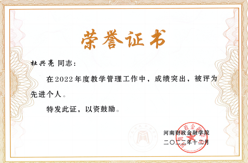 pp电子2022年度教学工作成绩斐然,荣获教学工作先进集体称号,杜兴亮、聂得欣荣获教学管理工作先进个人,夏长会和王璐荣获课堂教学磨课活动教学设计方案先进个人和讲课先进个人。