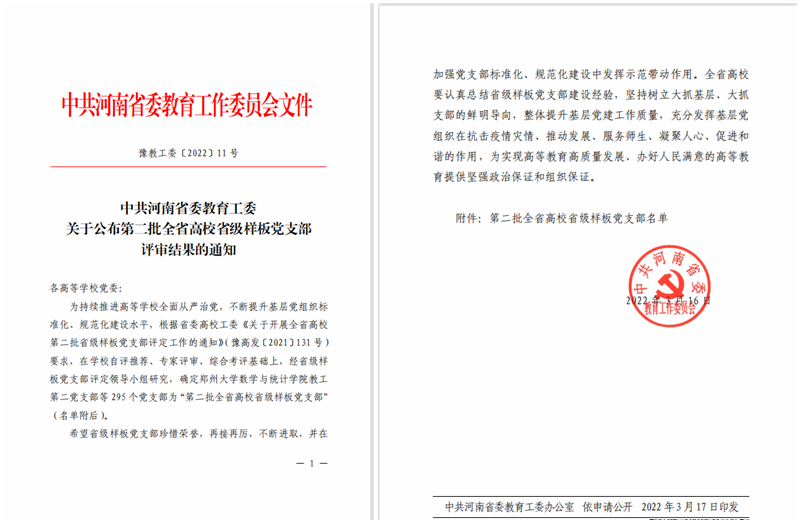 近日,中共河南省委教育工委下发《关于公布第二批全省高校省级样板党支部评审结果的通知》,pp电子5个党支部入选第二批全省高校省级样板党支部,我院学生第一党支部名列其中。
