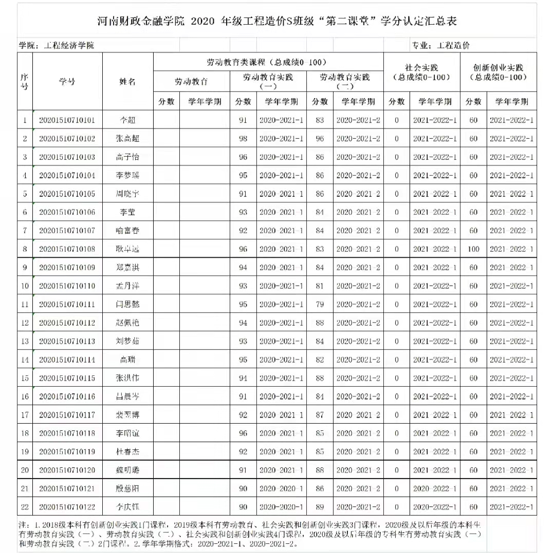 为进一步推进实施素质教育,全面落实立德树人的根本任务,培养具有创新精神和实践能力的高素质应用型人才,鼓励全体同学积极参加第二课堂活动,pp电子以2020级工程造价S本科班为试点班级,开展了对“第二课堂”相关课程学分认定工作。从12月9日至17日,由学生提出课程学分认定申请及佐证材料,辅导员、相关课程老师、学院领导组成学分认定小组,依次对2020级工程造价S本科班22名学生“第二课堂”相关课程的学分进行了认定。现将20工造S班“第二课堂”学分认定成绩公示如下: