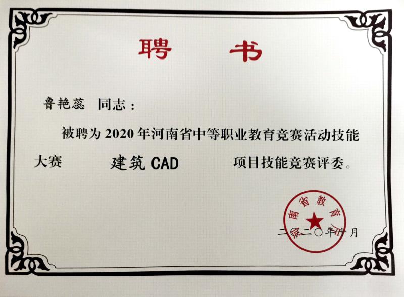 10月16日至17日,2020年河南省职业院校技能大赛(中职组)土木水利类建筑CAD赛项在焦作市职业技术学校成功举办,共有来自全省约70所院校139名选手参赛,pp电子pp电子游戏平台官网鲁艳蕊老师担任了该赛项评委组长。