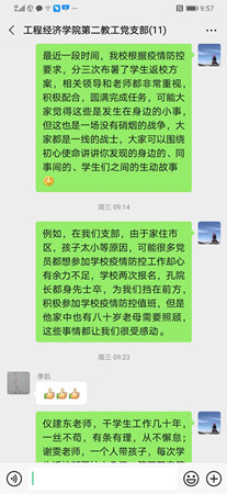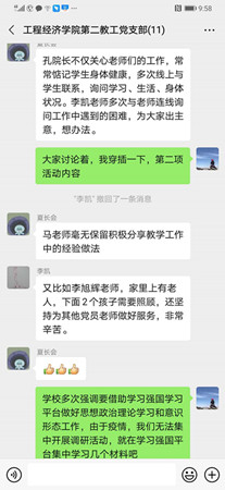 接着党员们结合工作实际发表了自己的看法。疫情期间,我们支部涌现了许多感人的事迹。学校两次防疫值班报名倡议,孔祥慧教授都身先士卒,克服家中也有八十岁老母需要照顾的困难,坚守值班防疫第一线,还常常惦记老师、学生们的身心健康,多次连线老师、学生,询问学习、生活、身体状况;李旭辉老师除需要照顾家里上老人、小孩,做好教学,指导学生实习工作外,还义务担当讲解员,为学院学位评估工作做出贡献;李凯老师多次与老师连线询问工作中遇到的困难,在网课教学方面为科室老师出主意,想办法;聂得新、李凯、胡天顺老师牺牲休息时间整理学位评估资料;马老师毫无保留给大家分享教学工作中的经验做法;姜蕾老师疫情期间积极与学生沟通,排查出因家庭困难不能按时上网课的十几名学生,发动教研室教师为学生捐款,保证学生能够在家接受网课教学。仪建东、谢雯、李雅鸽、丁贝贝老师都是冲在一线的学生工作者,从事学生管理一丝不苟,有条有理,从不懈怠。支部每位党员在抗疫期间表现不仅让我震撼、感动,更让我们看到了党员们“初心使命、争当先锋”的风采。
