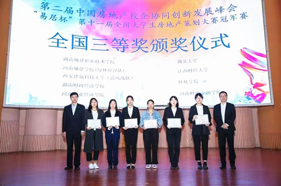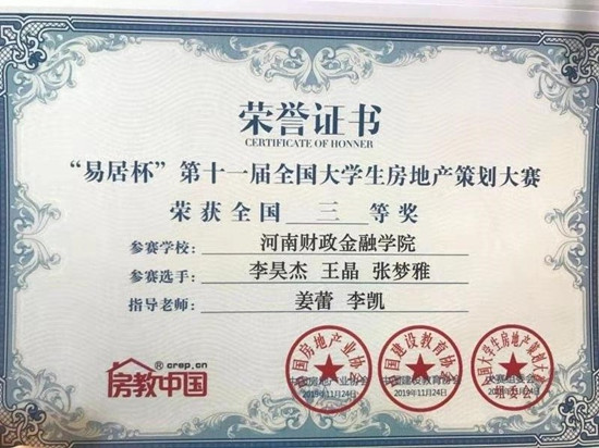 11月24日,由中国房地产业协会指导、中国建设教育协会主办的“易居杯”第十一届全国大学生房地产策划大赛在深圳大学沧海校区举行。pp电子姜蕾、李凯2位教师指导的2017级房地产经营与管理专业张梦雅、王晶、李昊杰3位学生组成的代表队,经过激烈角逐,荣获全国三等奖。