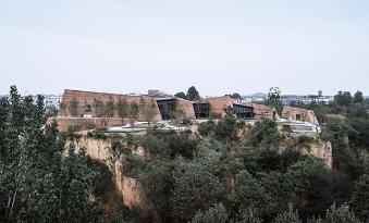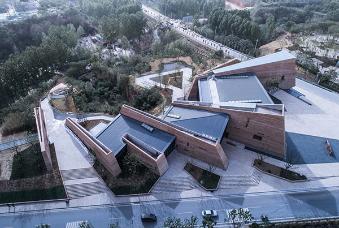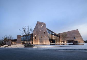 中原文化小镇游客中心,设计构思来源于当地黄土沟壑风积地貌印象,一片片高低错落的厚重墙体,用一种与环境融合的低姿态,表达了对场地的尊重;然而统一的母题式语汇,又呈现了建筑群落的气势和整体感,达到了极强的视觉冲击力和震撼力。建筑外立面大胆尝试使用夯土外墙饰面,以表达对地域性和自然环境的尊重。通过夯土咨询团队科学合理地系统设计,和建筑设计团队的对质感和色彩控制,选用当地的原色红土和原色黄土为原材料和上下基础色阶,以150mm作为一个夯土层,逐层施工,最终形成自上而下由赭石色过渡到土黄色的大体效果。郑州建业足球小镇游客中心,至今为止全球高度最高的纯手工夯土建筑,是将建筑功能、自然风貌、地域文化和当代审美完美结合的一次实践,是传统建筑工艺与当代施工技术相结合的一次探索与大胆尝试,浑然一体的建筑和环境,让建筑充满了力量。