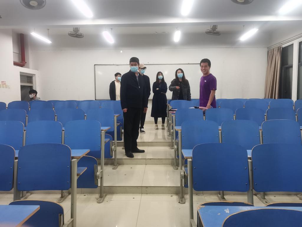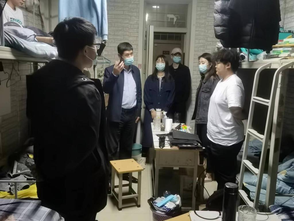 5月11日晚,学院党总支书记郭立君,住校值班老师夏琪琦、王佳楠、胡航、胡振宇深入教室、学生宿舍检查走访,进一步了解掌握封校期间同学们的学习、生活情况和思想动态,开展疫情防控政策宣传和学校封闭管理要求的解释引导工作。