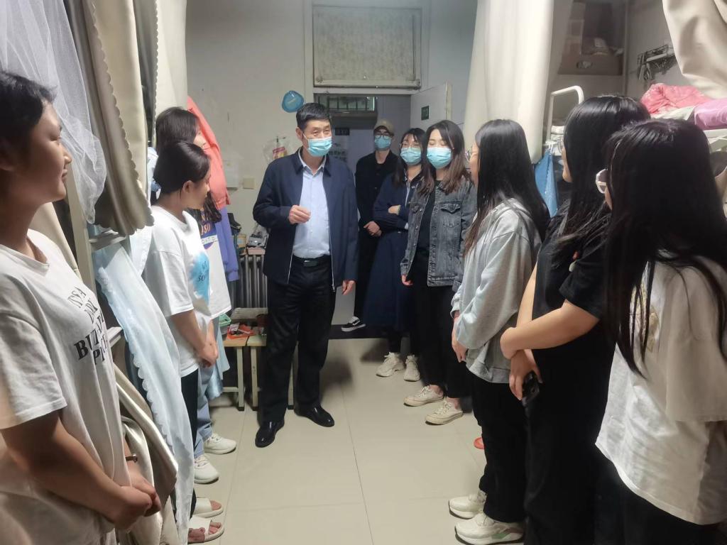 在深入学生宿舍走访时,郭立君和辅导员老师与同学们亲切交流,深入了解大家网课学习和封校生活中遇到的问题和困难,对学生进行安抚和心理疏导。同时叮嘱学生注意寝室卫生,养成良好的生活习惯,做好自我防护,保持积极向上的健康心态,齐心协力打赢疫情防控阻击战。