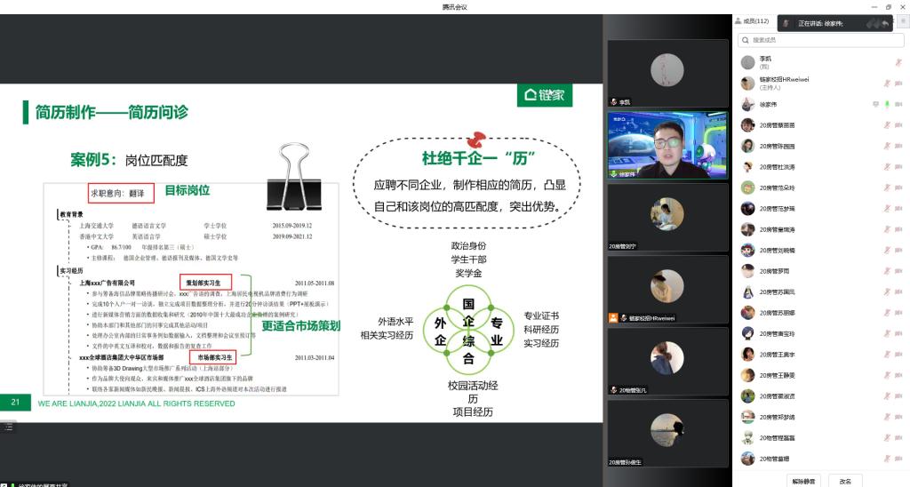 11月13日上午,校企合作单位上海链家总部校园品牌部经理徐家伟,为pp电子学生开展题为《简历制作与面试有道》的实训讲座,2020级房地产、物业管理和2021级房地产专业共计100余名学生参加,由于疫情影响,本次讲座利用腾讯会议室平台在线开展。