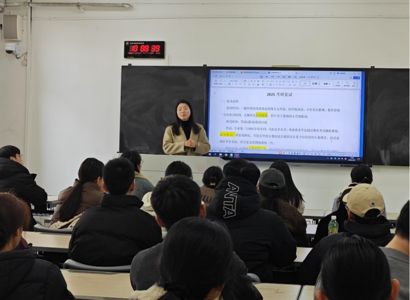 讲座以“复试全流程导航图”为纲,逐项解析资格审查、英语测试、专业面试、实践考核等环节的具体要求,特别设置“学长学姐有话说”环节,邀请2023年、2024年考研上岸的优秀校友们为同学们分享自己在复试备考过程中的心得体会、备考策略、调剂流程和面试技巧。整场讲座涵盖了从个人陈述的撰写到面试礼仪的注意事项,再到如何应对突发状况的应变技巧,内容丰富而实用,同学们纷纷表示收获满满。