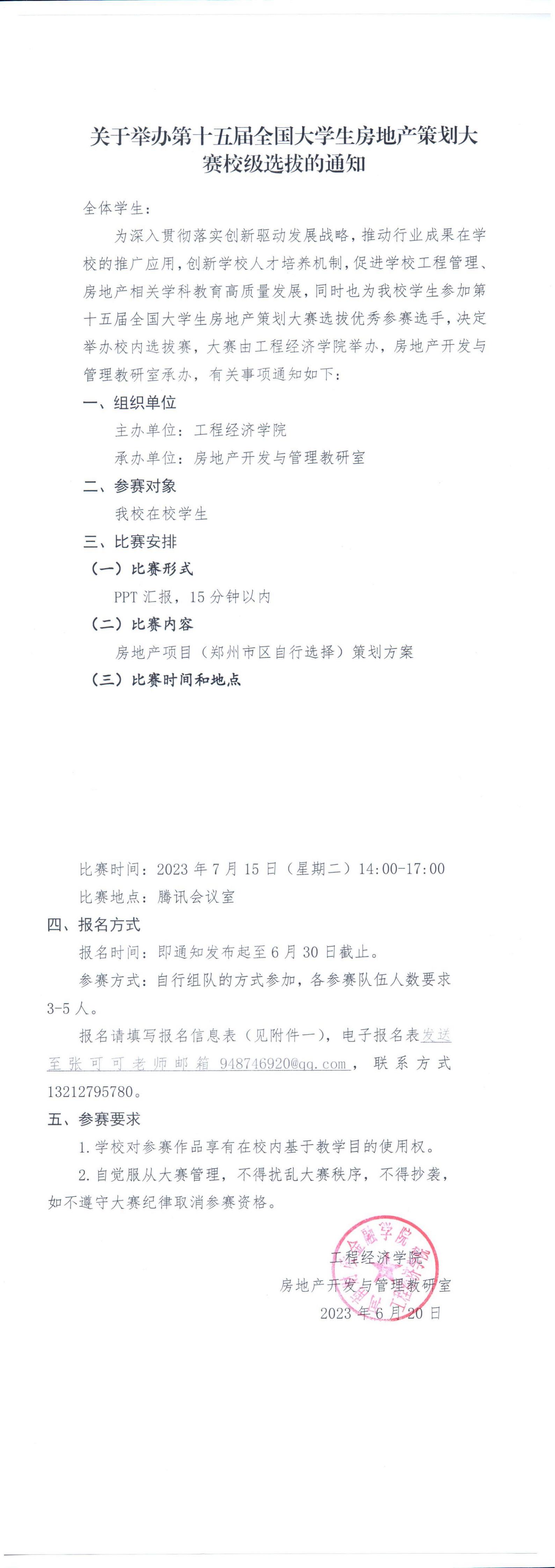 关于举办第十五届全国大学生房地产策划大赛校级选拔的通知