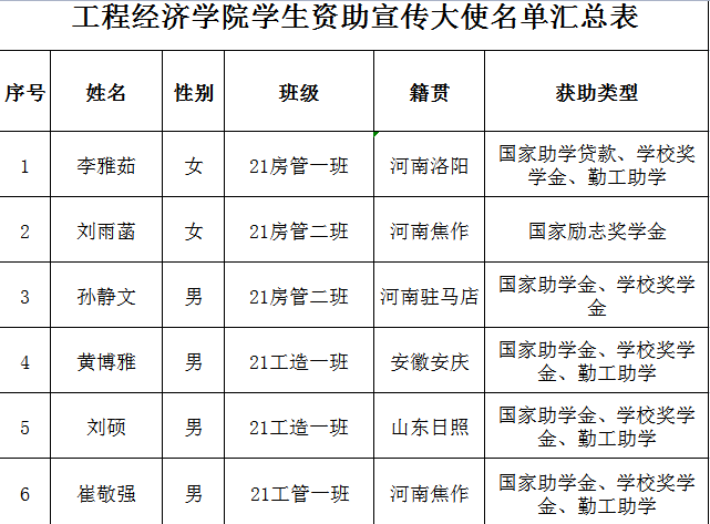 为进一步加大学生资助政策宣传力度,充分发挥受助学生政策传播与励志引领作用,切实提升资助育人实效,根据学校“诚信教育宣传月”活动有关安排,2023年6月上旬,pp电子游戏平台官网组织开展了“学生资助宣传大使”的遴选工作。经过个人自荐、各班推荐、学院评选等环节,6名同学脱颖而出,成功入选pp电子“学生资助宣传大使”,并被推荐参加校级选拔。