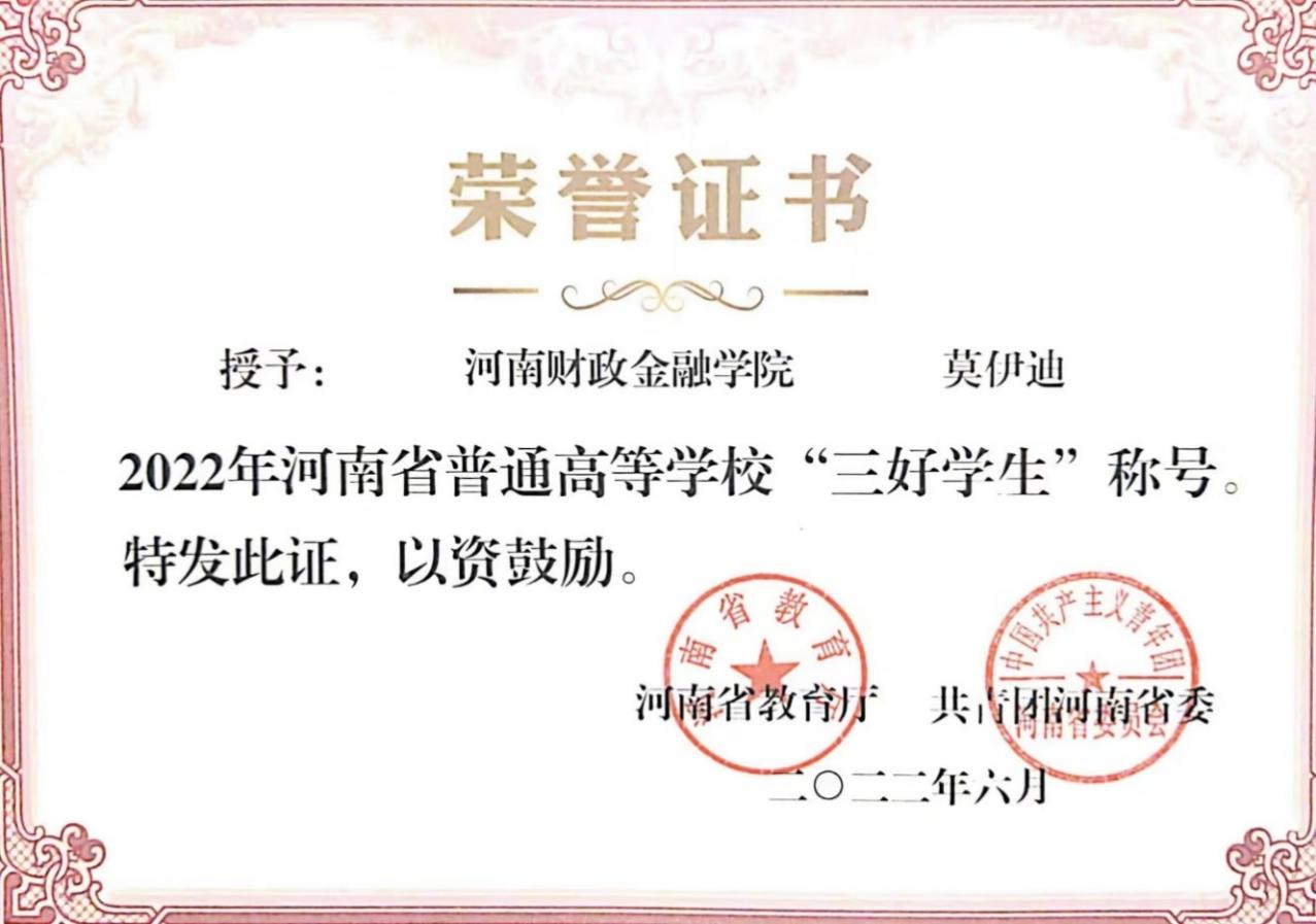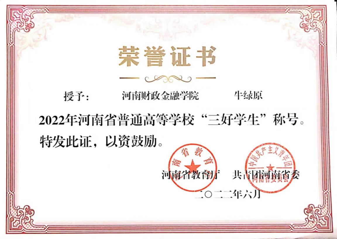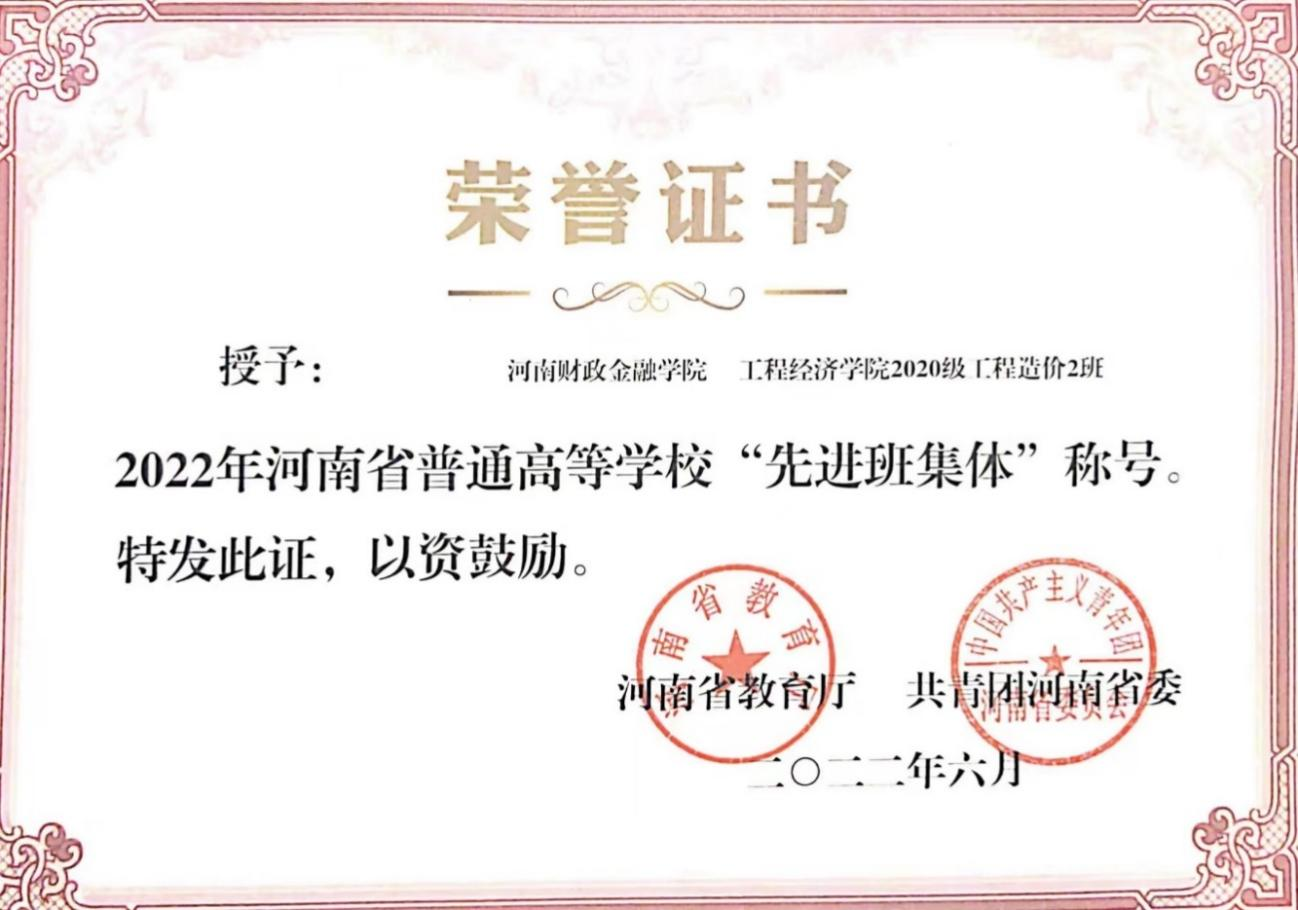 根据《河南省教育厅 共青团河南省委关于公布2022年河南省普通高等学校三好学生、优秀学生干部和先进班集体名单的通知》(教学〔2022〕195号)文件精神,我院莫伊迪、余彬、牛绿原、陈晓玥、陈兆祥5名同学荣获省级“三好学生”荣誉称号,高婧婉获省级“优秀学生干部”荣誉称号,2020级工程造价2班被评为省级“先进班集体”。