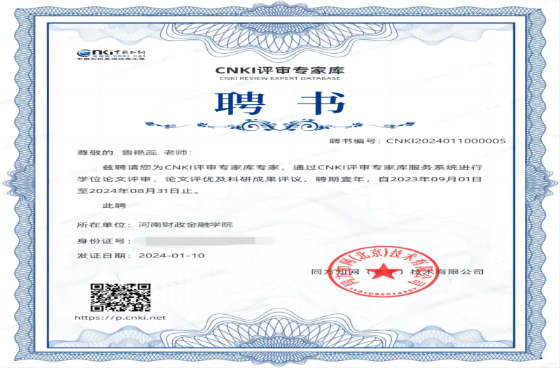 近日,中国知网鉴于所在学科的成就和丰富的学术成果,邀请pp电子pp电子游戏平台官网鲁艳蕊副教授作为评审专家入驻CNKI专家库。