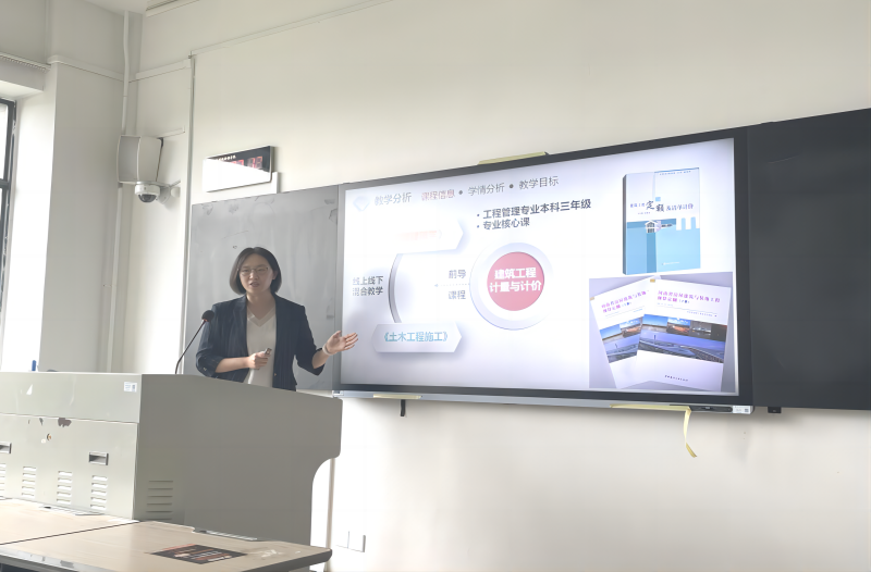 石静老师按照“两性一度”和“OBE”的教学理念精心设计教学过程,采用线上线下混合式教学,为老师们上了一堂生动的《建筑工程计量与计价》课程。讲内容为课程第三章《土石方工程》授课中充分借助现代教学技术手段,创设教学情景,用PPT动态展示沟槽的设计开挖、土石方的计量计价,用理论与案例相结合的方式自然衔接各教学环节,巧妙融入思政元素,通过不断启发设问,引导学生思考,深入浅出的讲解、阐释授课过程中的重点和难点问题。石静老师为师生们呈现了一次灵动、娴熟、自然、高水平的观摩盛宴。