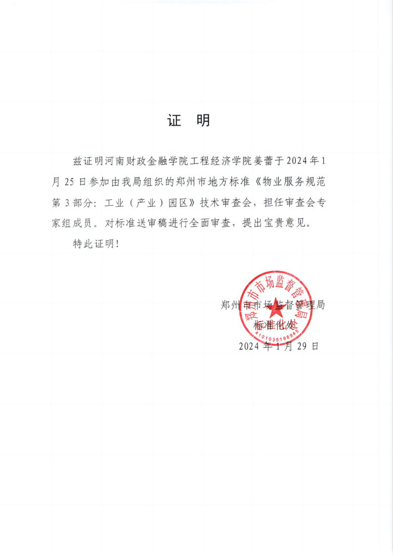 1月25日,pp电子房地产开发与管理教研室主任姜蕾受聘郑州市市场监督管理局,担任郑州市地方标准《物业服务规范第3部分:工业(产业)园区》技术审查会专家,对标准送审稿进行全面审查。
