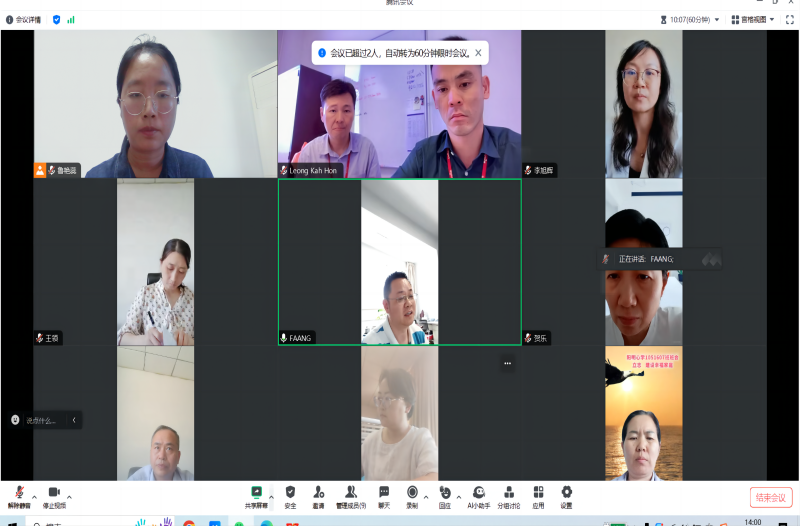 马方教师Ng Choon Aun和Leong Kah Hon分享个人成长与学术研究成果,展示了本学期讲授课程讲义、教案与授课资料,同时设立专题讨论环节,讨论中马合作办学中的挑战和机遇,共同探讨解决方案。校级督导史翔对中马合作办学授课情况提出要求,更好提升教学质量。