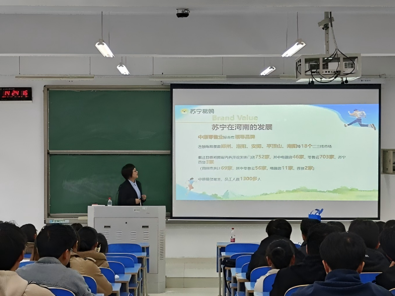 宣讲会现场,苏宁易购集团股份有限公司人力资源部经理张霞通过播放宣传片、PPT展示、面对面交流的方式向同学们认真介绍了公司的基本情况、企业理念以及苏宁1200工程中对人才的需求条件,就大家关心的个人发展路径、招聘职位、任职要求、薪资待遇等进行了详细解答。同学们认真聆听,积极投递简历,会场气氛热烈。公司招聘团队现场进行了初步的筛选和面试工作。